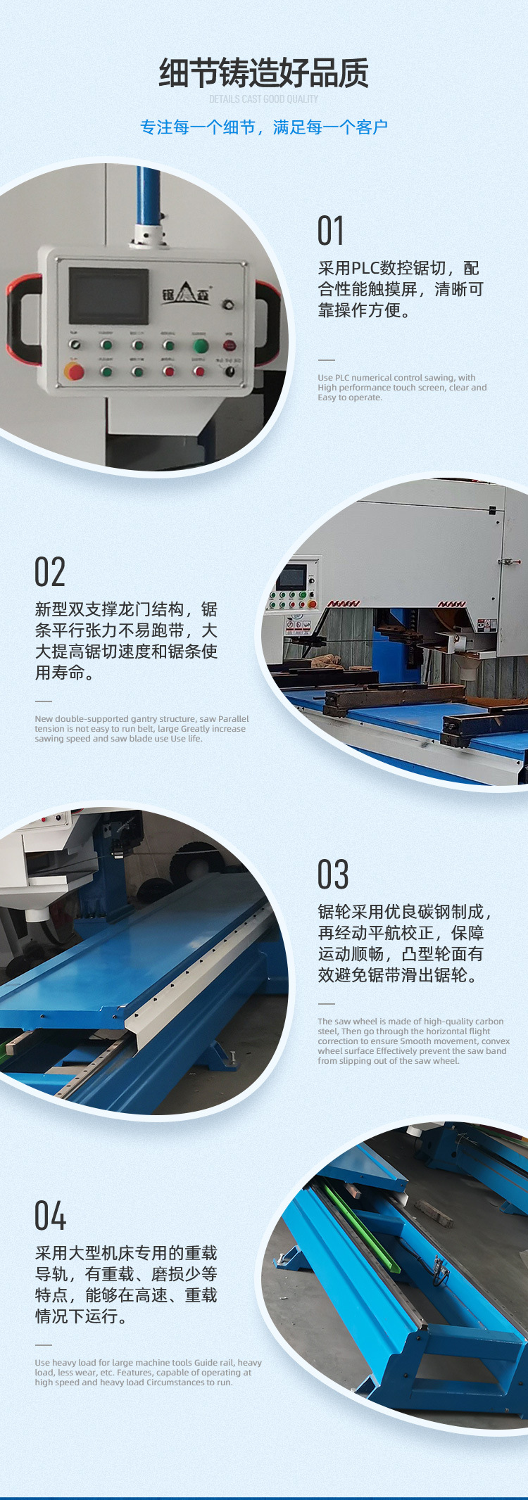 ①:直線導軌:45型號,品牌:德國力士樂 ②:升降絲桿:M40×20型號,品牌:德國力士 ③:司服電機:惠川3.7KW/2臺 ④:帶鋸輪軸承:SKF,30315型號/4個,品牌:德國 ⑤:減速機品牌:廣東杰豐 ⑥:PALC品牌:惠川 ⑦:觸摸屏品牌:7寸,惠川 ⑧:主電機品牌及產地:37KW,浙江江天集團上市公司 |